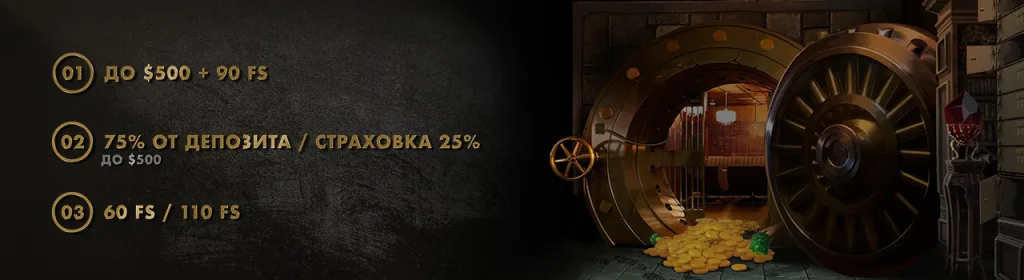 | бонус | 90 FS и 100% к депозиту | 75% к депозиту | 60 FS к депозиту | 110 FS к депозиту |